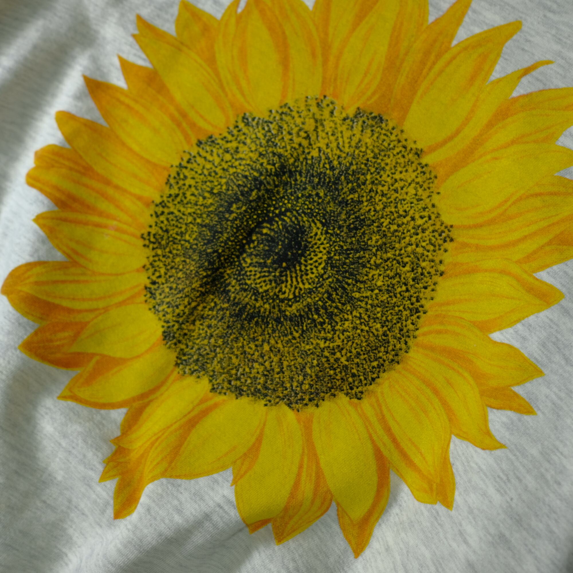 エクアドルニットのような、大判のひまわりプリントスウェット。