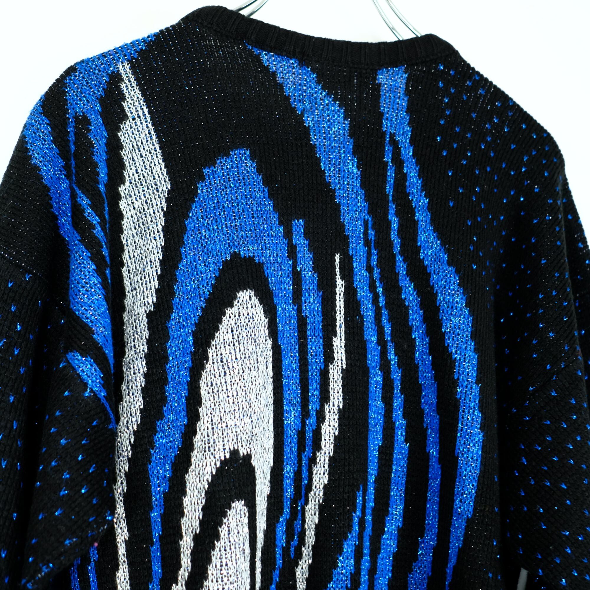 ブルーとシルバーの部分にはラメ糸(メタリックヤーン)が編み込まれており、光の当たり方で表情が変わるモードでラグジュアリーな質感です。