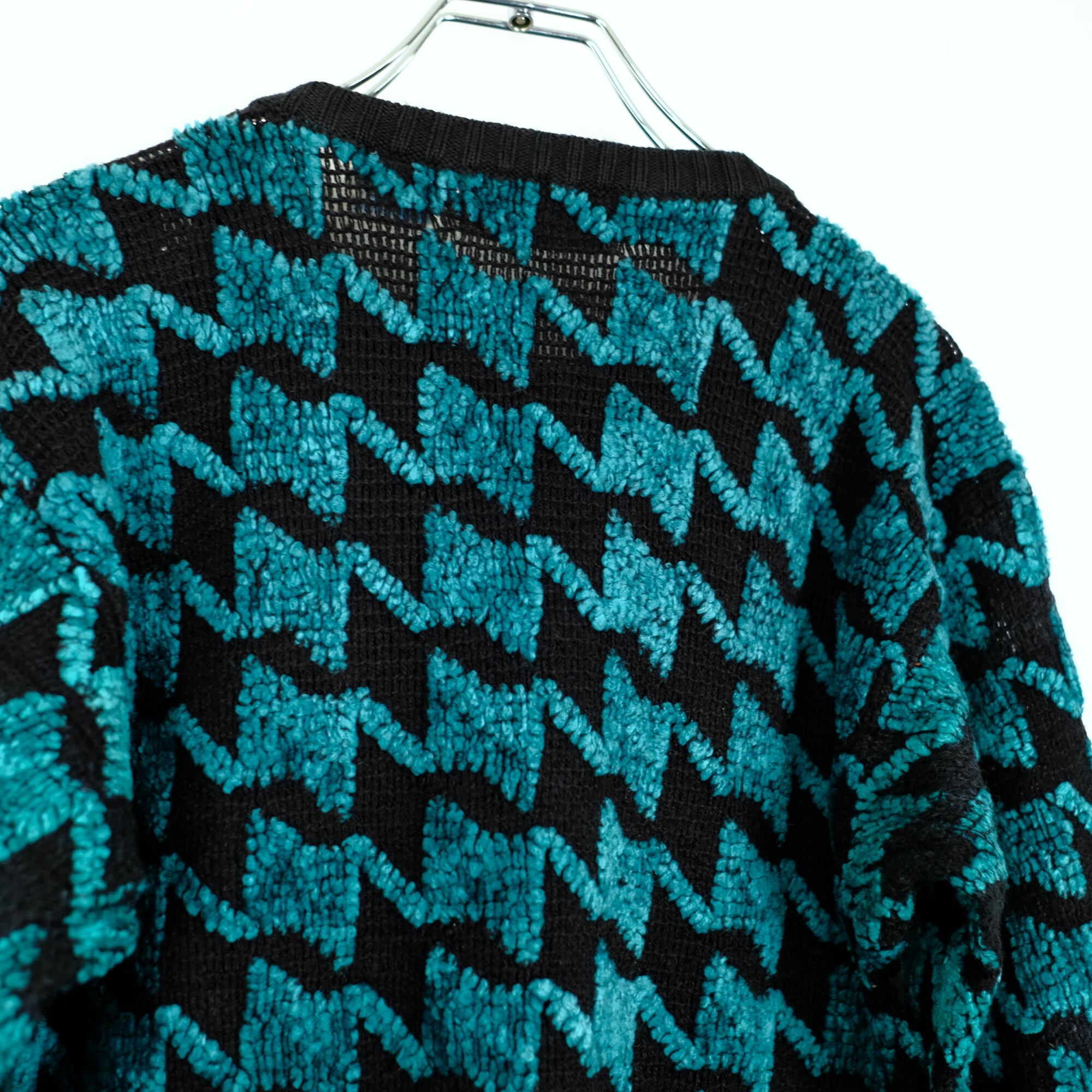 最大の特徴は、凹凸感のある独特な立体編み(3Dニット)。鮮やかなターコイズブルーとブラックが交互に配置されたジグザグの幾何学模様がとても良い1着。