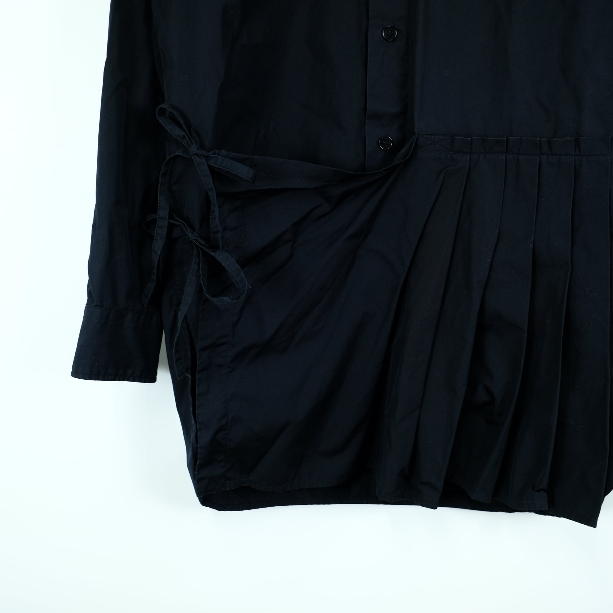 紐の結び方次第でシルエットに変化をつけることができ、羽織りとしても、一枚の主役シャツとしても圧倒的な存在感を放ちます。