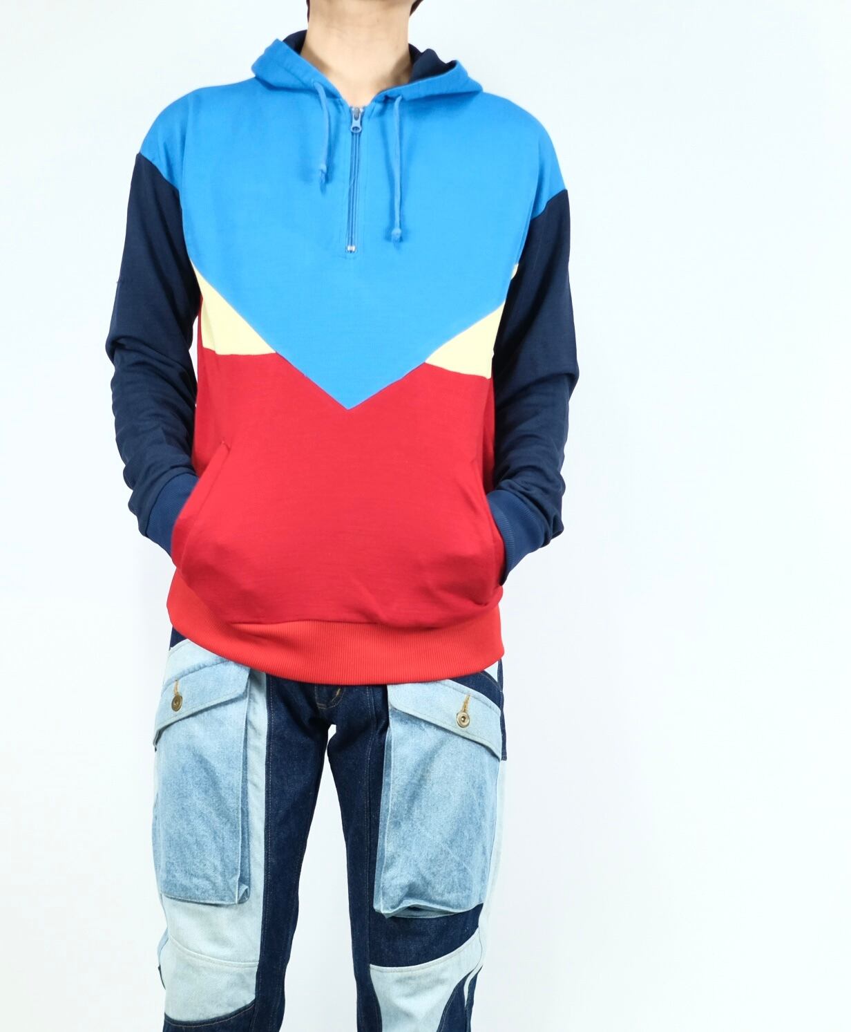 鮮やかなブルー、レッド、イエロー、ネイビーを組み合わせた、マルチカラーパーカーです。