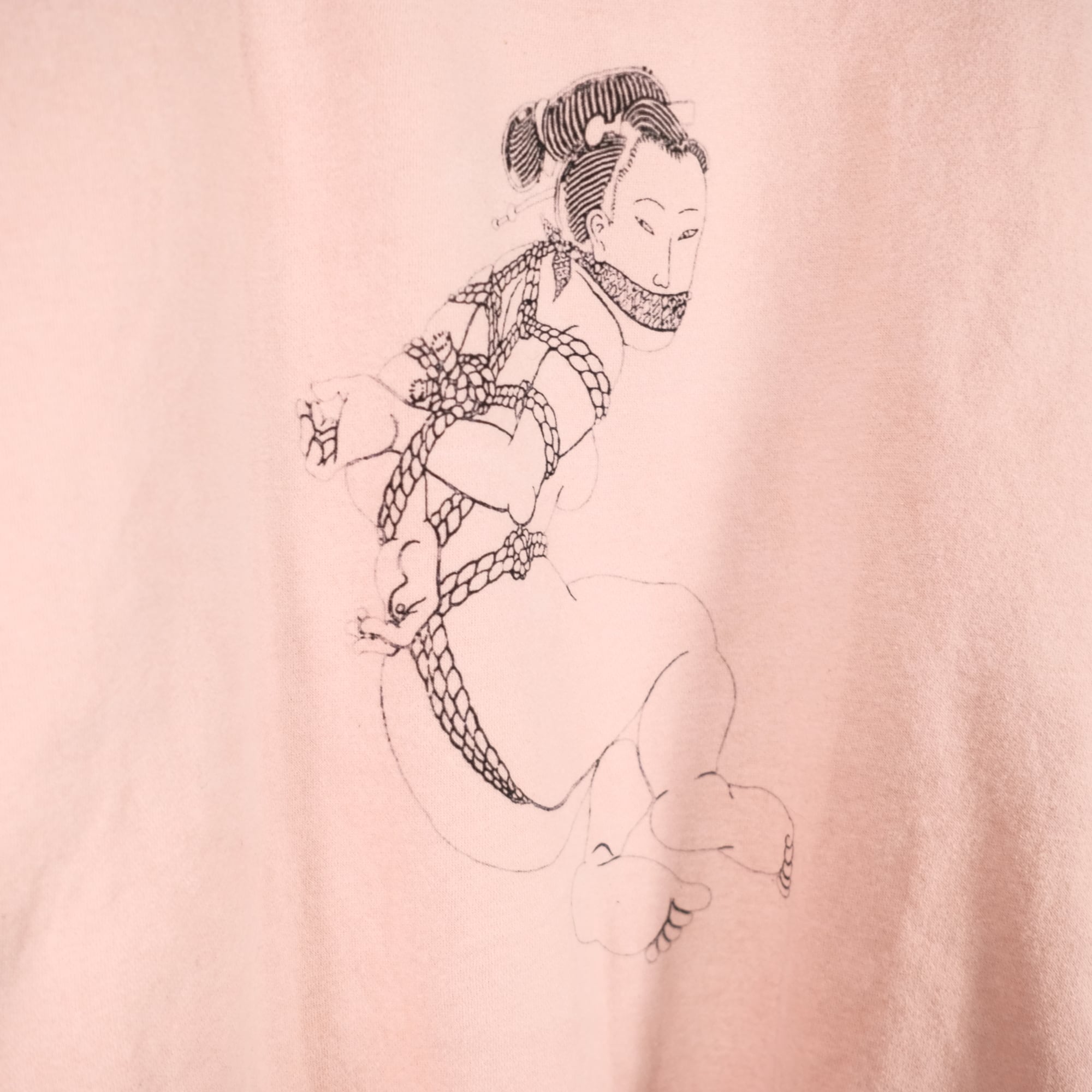 淡いベビーピンクのボディに、日本の伝統的な「緊縛」をモチーフにしたイラストがプリントされたスウェットです。