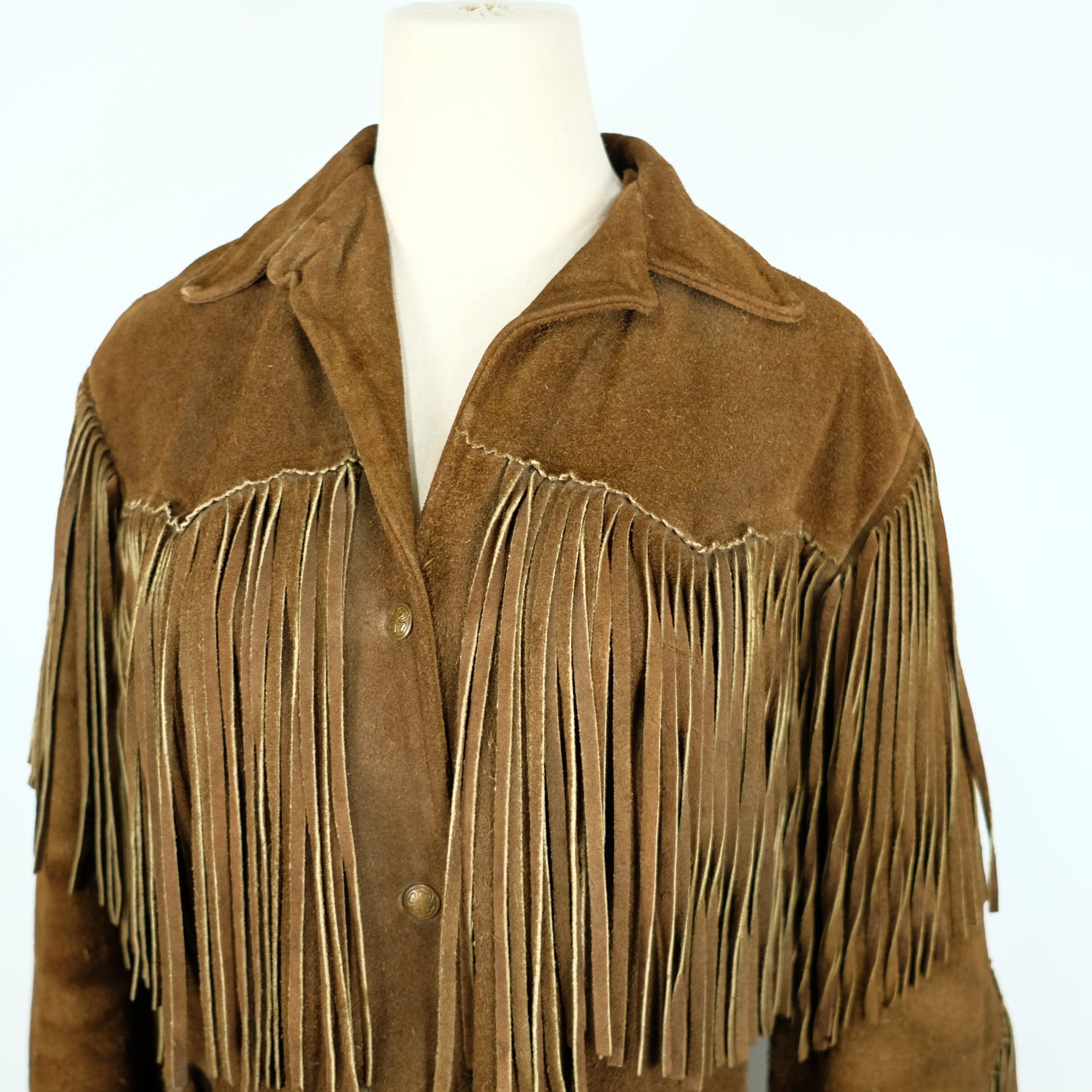 フロント、バック、袖、ポケット部分に長いフリンジが施されたインパクトのあるデザインです。