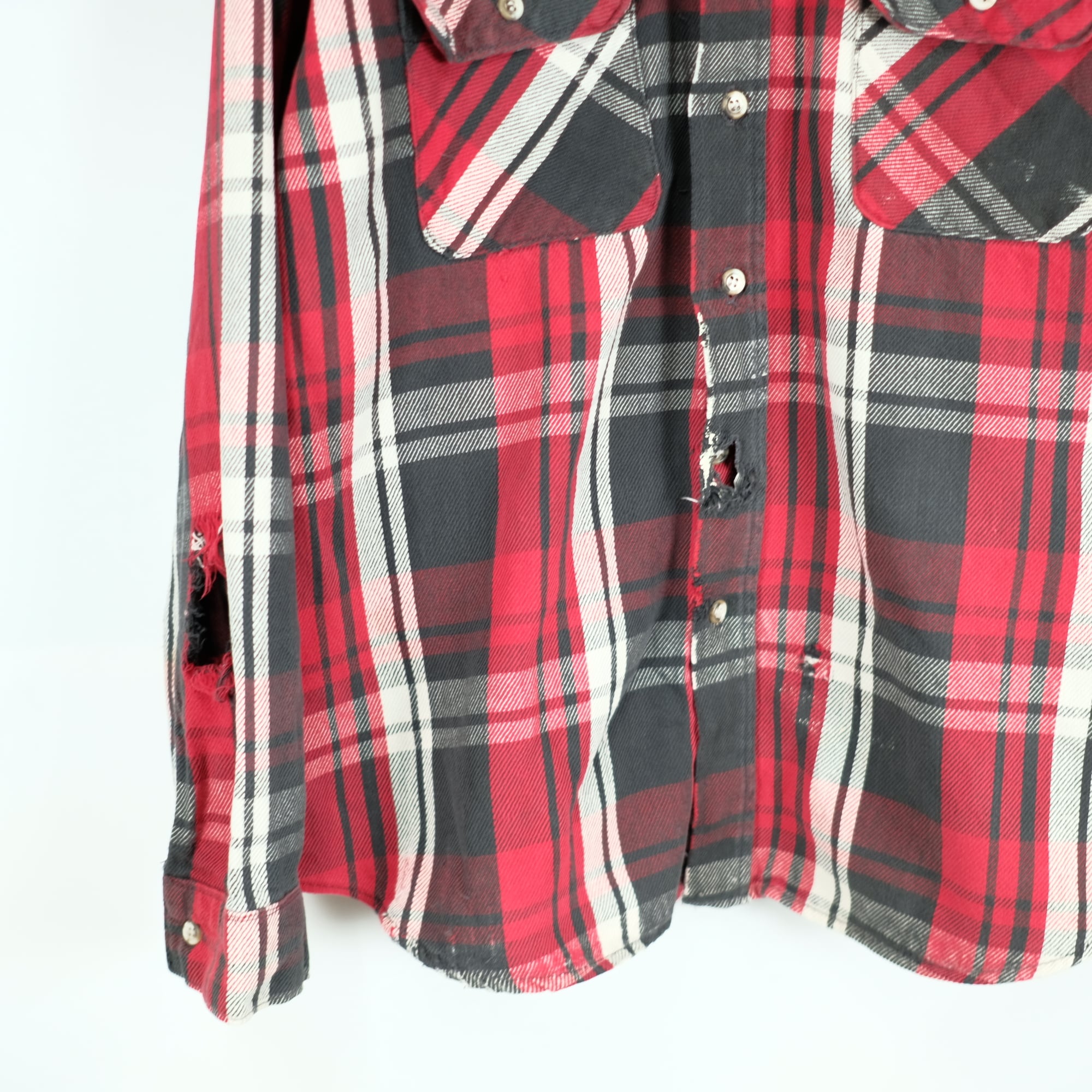 袖口、肘、フロント裾付近、身頃など全体に激しい擦れ、破れ、穴あきがあります。