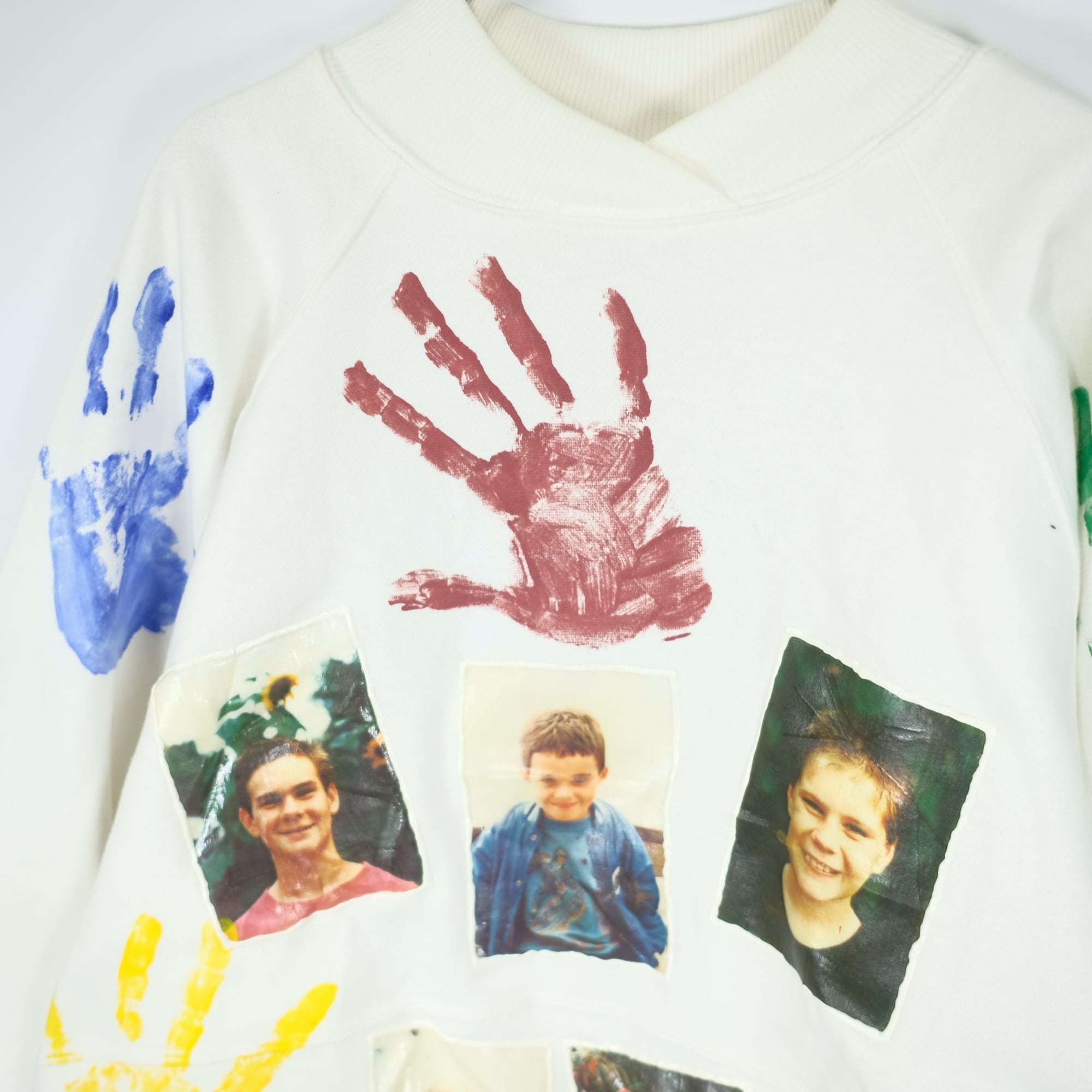 Vガゼット風のネックライン、ラグランスリーブ仕様。フロント・バック・袖にフォトプリントと手形ペイント。