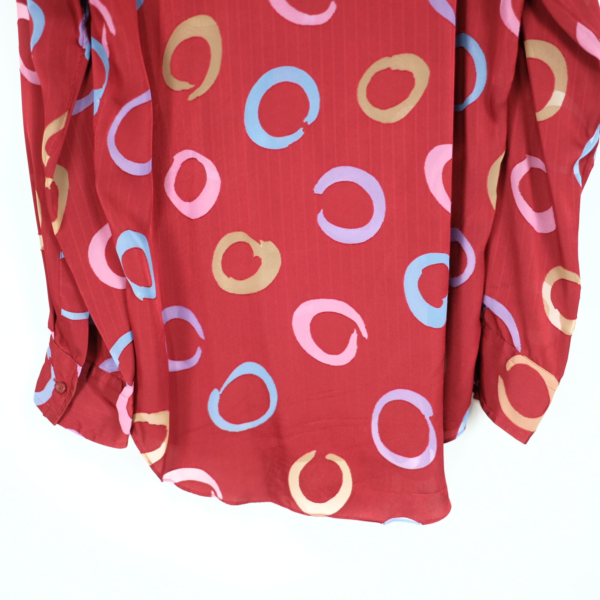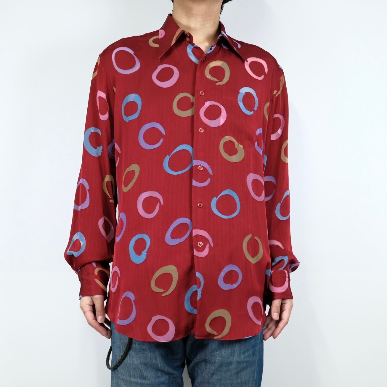 ボルドー・レッドをベースに、刷毛で描いたようなサークル柄(ドット)が全面に配されたインパクトのあるデザイン。
