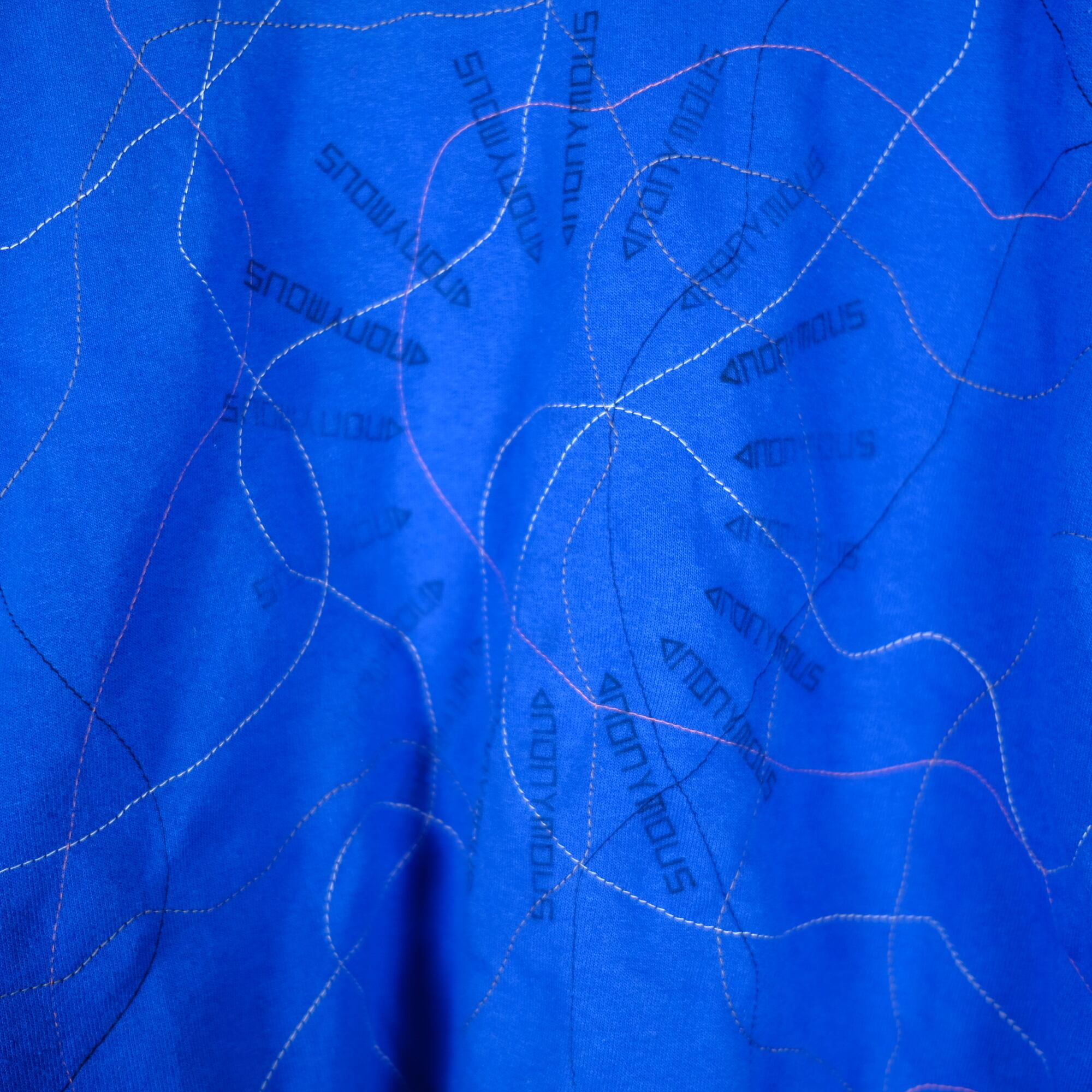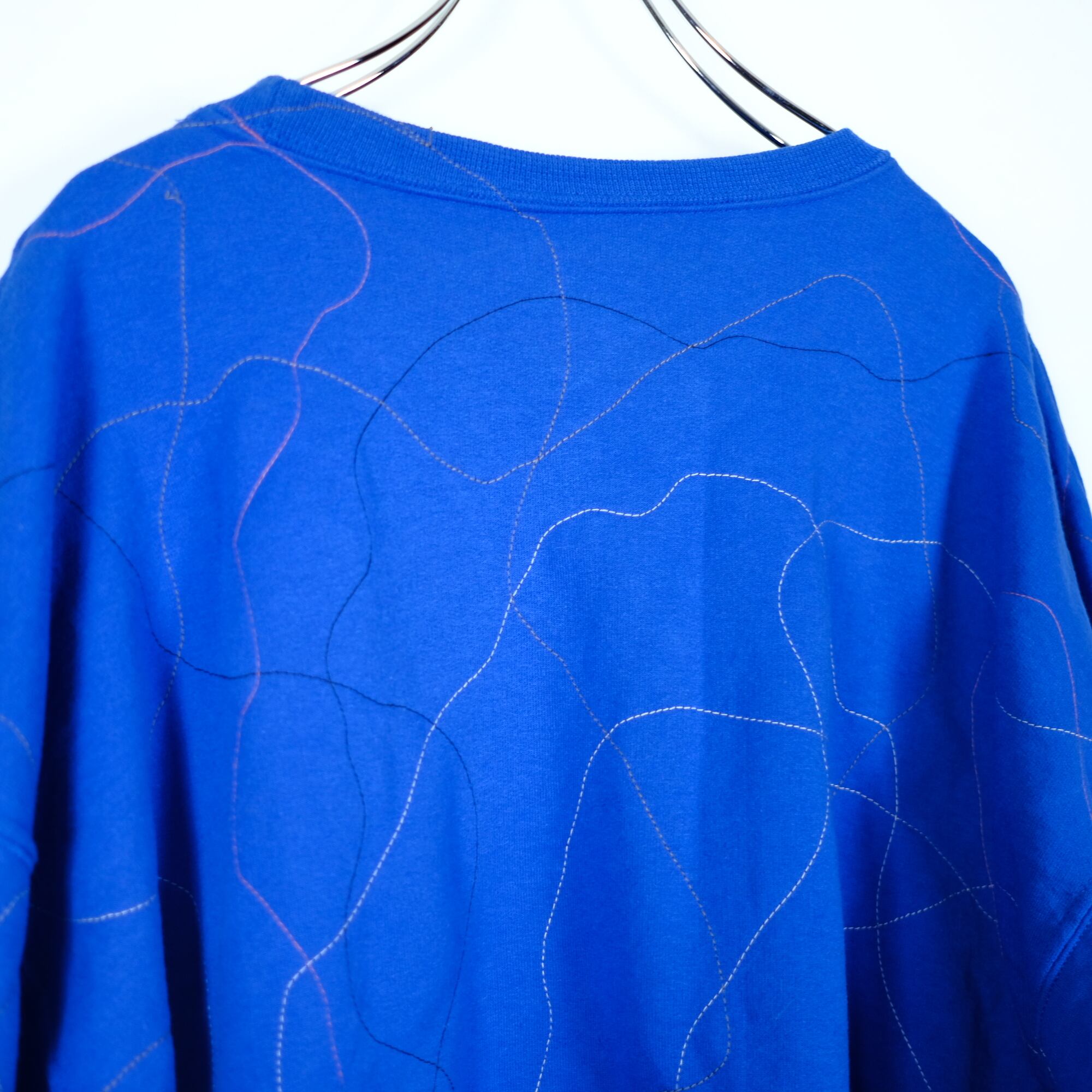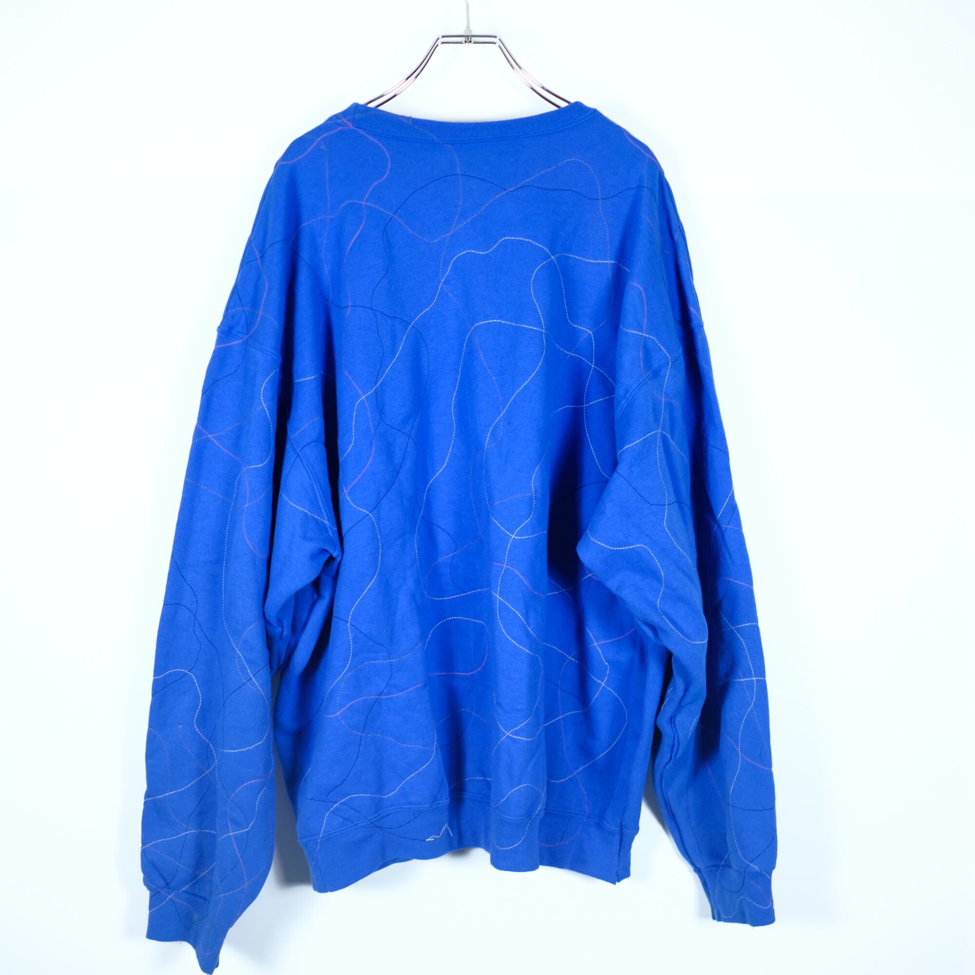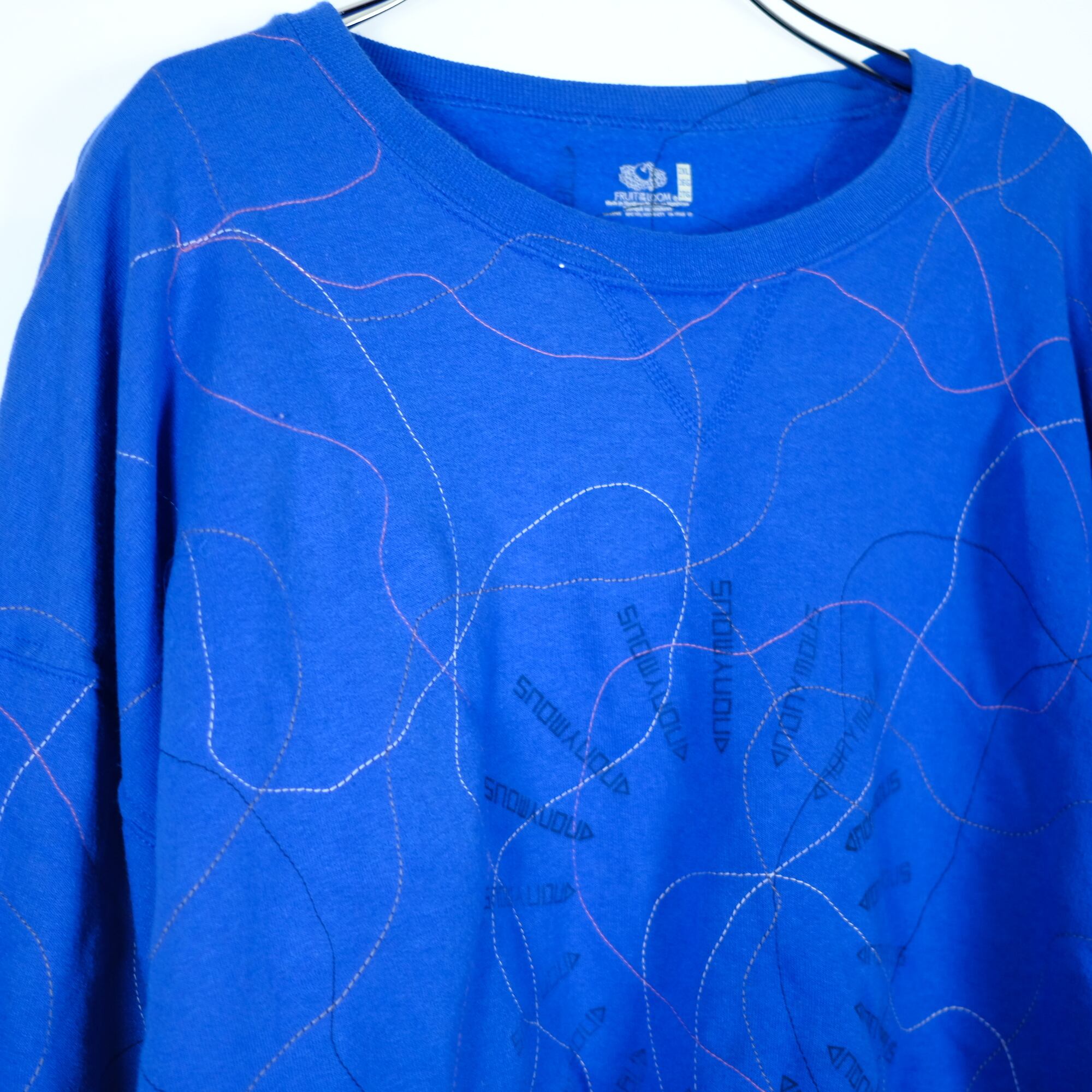 2000年代のFruit of the Loom 2XLの青のスウェットに、前見頃にロゴスタンプと全面にステッチワークを施したもの。